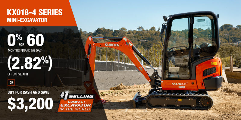 Representative finance example for the KX018-4: $51,974.97 financed at 0% (2.82% effective APR which factors in $3,200.00 in non stackable cash that cannot be combined with finance offers) equals $780 monthly for 60 months. $5,200.00 down payment required. Cost of borrowing is $3,200.00 for a total obligation of $51,974.97. Financing available on approved credit. Prices and payments include freight and other applicable fees (including environmental fees, administration fees, set-up fees, and dealer fees on the model specified). Excavator Claim: "Kubota is the world’s #1 selling compact excavator for 20 years." Disclaimer: According to 2023 data from Off-Highway Research including all Kubota Group brand sales. Offer valid until 06-30-2026.