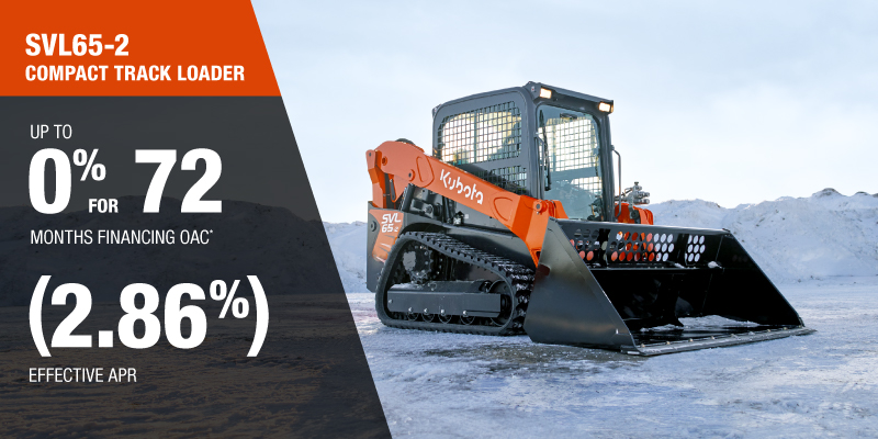 *For all offers: Prices and payments include freight and other applicable fees (including environmental fees, administration fees, set-up fees, and dealer fees). Taxes, delivery fees, insurance and registration are extra. Dealer may sell for less. Dealer order/trade may be necessary (but may not be available in all cases). Some restrictions apply. Offers valid only at participating dealers in Canada and are subject to change, cancellation or extension at any time without notice or obligation. Minimum down payment of 10% required for financing offers on turf and agricultural products. Specifications, features, illustrations and equipment shown are based on the latest available information at the time of publication. Some models are shown with optional accessories available at extra cost. Although descriptions are believed to be correct, accuracy cannot be guaranteed. We reserve the right to make changes at any time, without notice or obligation to specifications, accessories, materials, models, prices, payments and other information. Offer valid until March 31, 2026. See your participating Kubota dealer or visit www.kubota.ca for complete details.