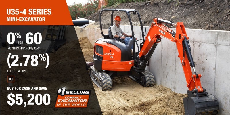 Representative finance example for the U35-4: $85,546.39 financed at 0% (2.78% effective APR which factors in $5,200.00 in non stackable cash that cannot be combined with finance offers) equals $1283.82 monthly for 60 months. $8,558.77 down payment required. Cost of borrowing is $5,200.00 for a total obligation of $85,546.39. Financing available on approved credit. Prices and payments include freight and other applicable fees (including environmental fees, administration fees, set-up fees, and dealer fees on the model specified). Excavator Claim: "Kubota is the world’s #1 selling compact excavator for 20 years." Disclaimer: According to 2023 data from Off-Highway Research including all Kubota Group brand sales. Offer valid until 06-30-2026.